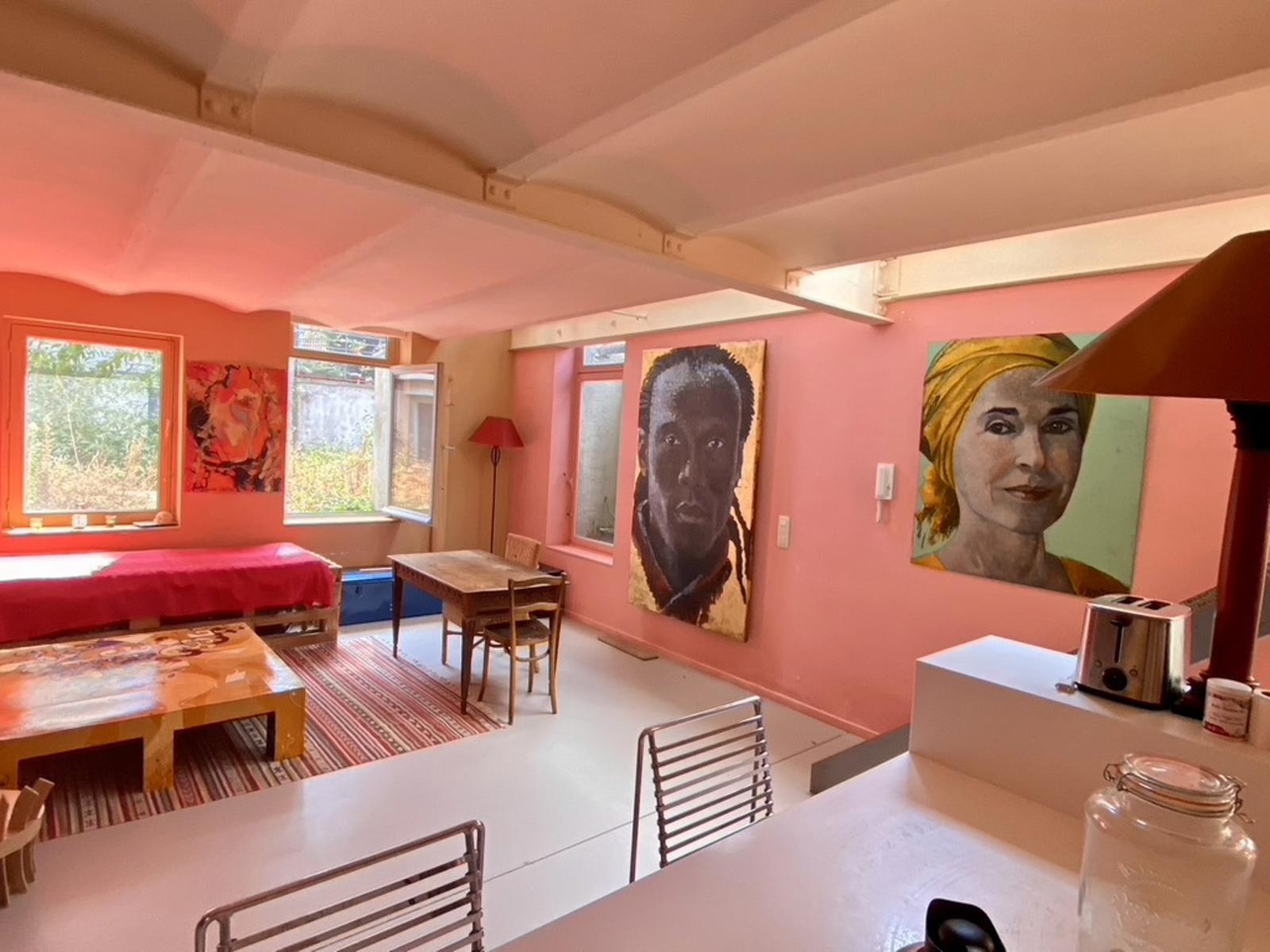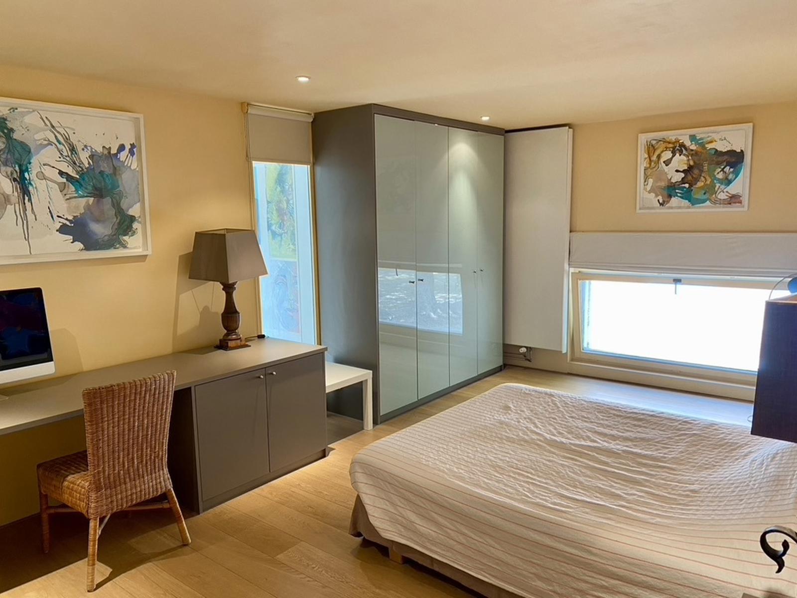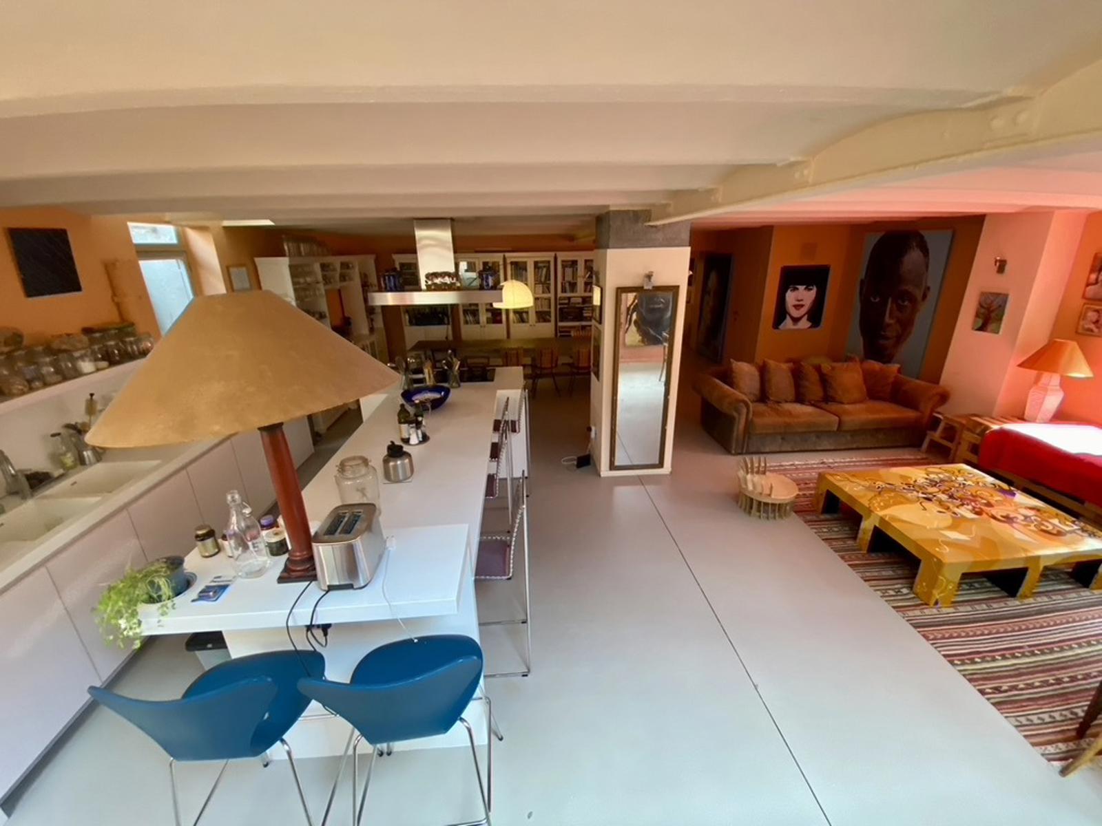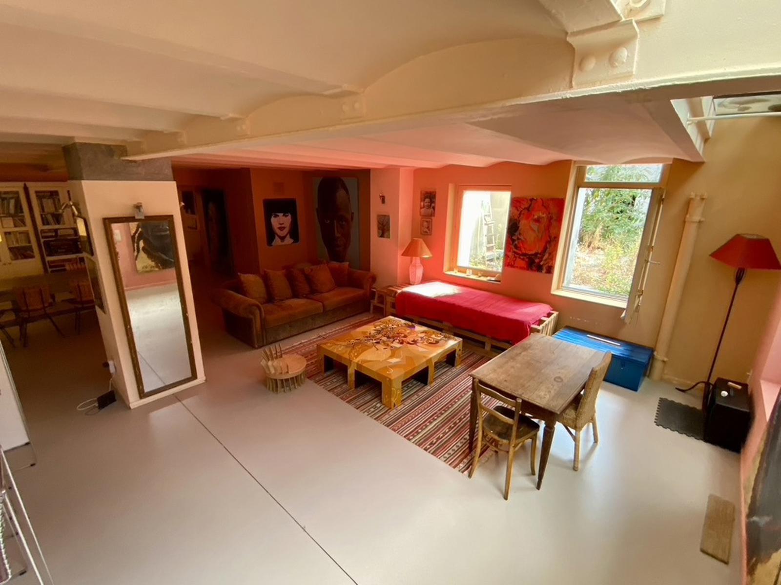 On the ground floor, the main entrance with double doors opens onto a large hall comprising the cloakroom, the guest toilet and the staircase leading to the mezzanine. On the left, the first large bedroom (35 m2) and its bathroom (bath, double sink and toilet). On the right, a huge living room (84 m2) enjoying a beautiful light thanks to its 7 large windows. A double glazed door leads to a small garden of which the occupant of the loft has exclusive enjoyment.