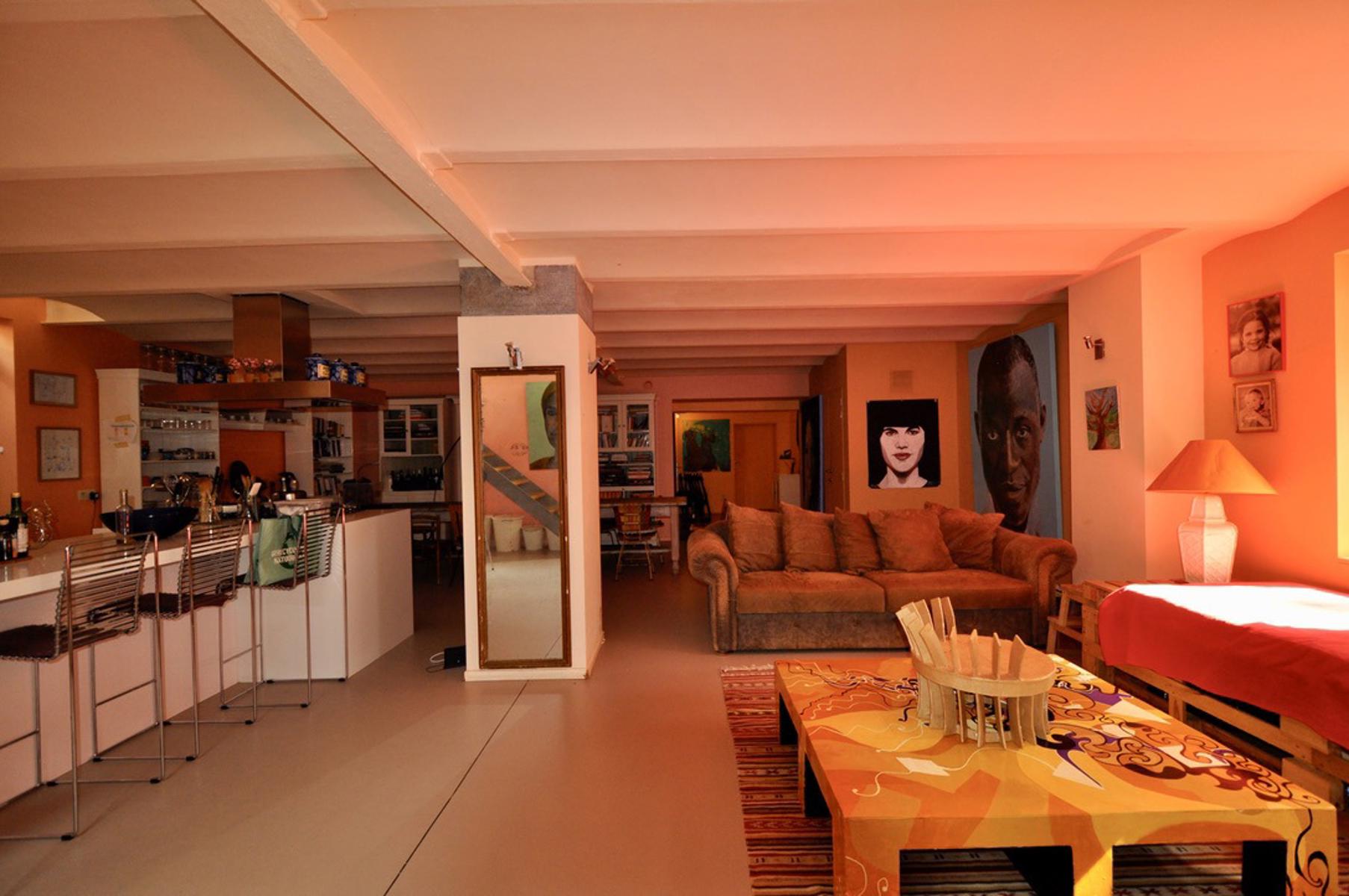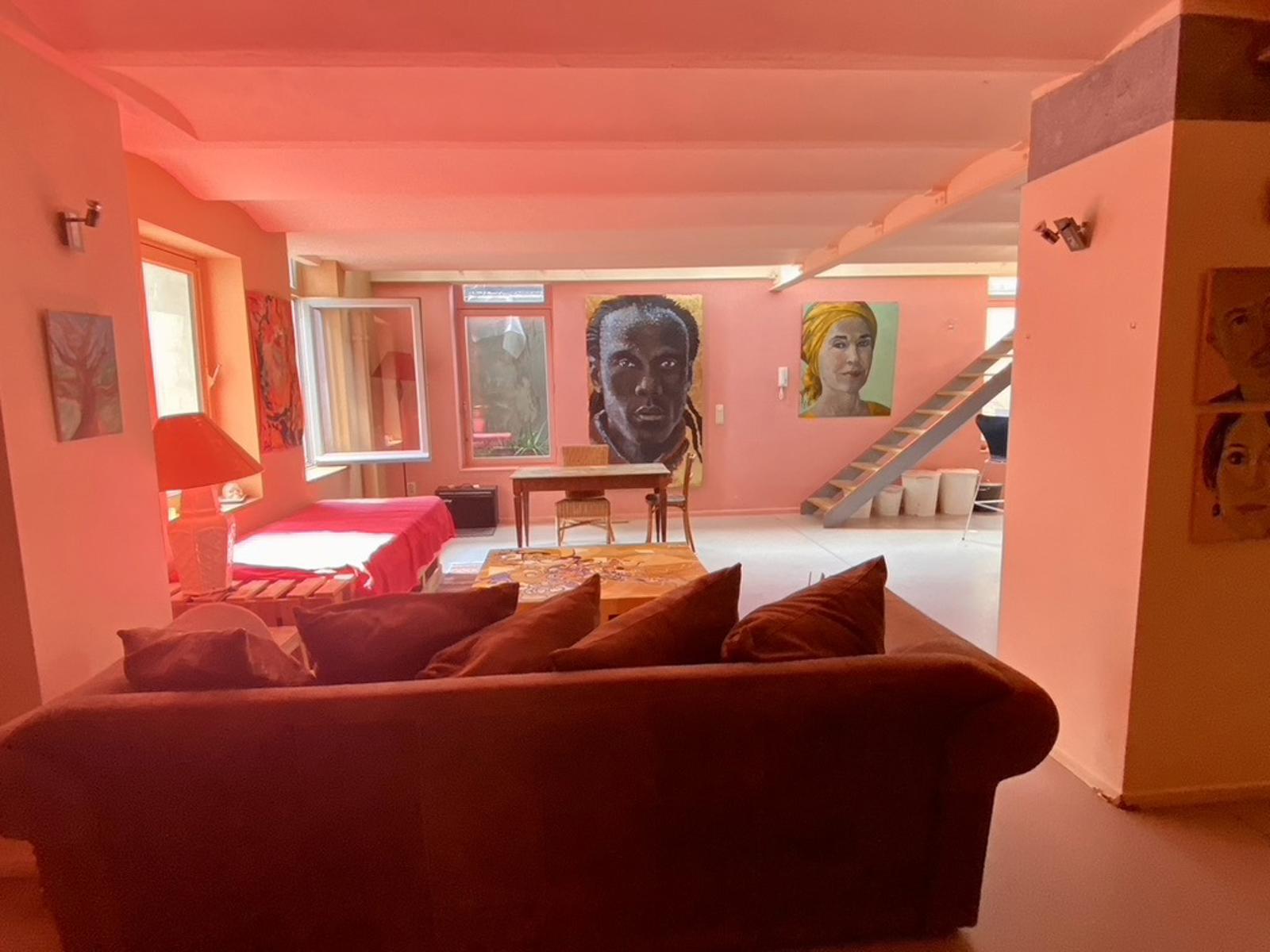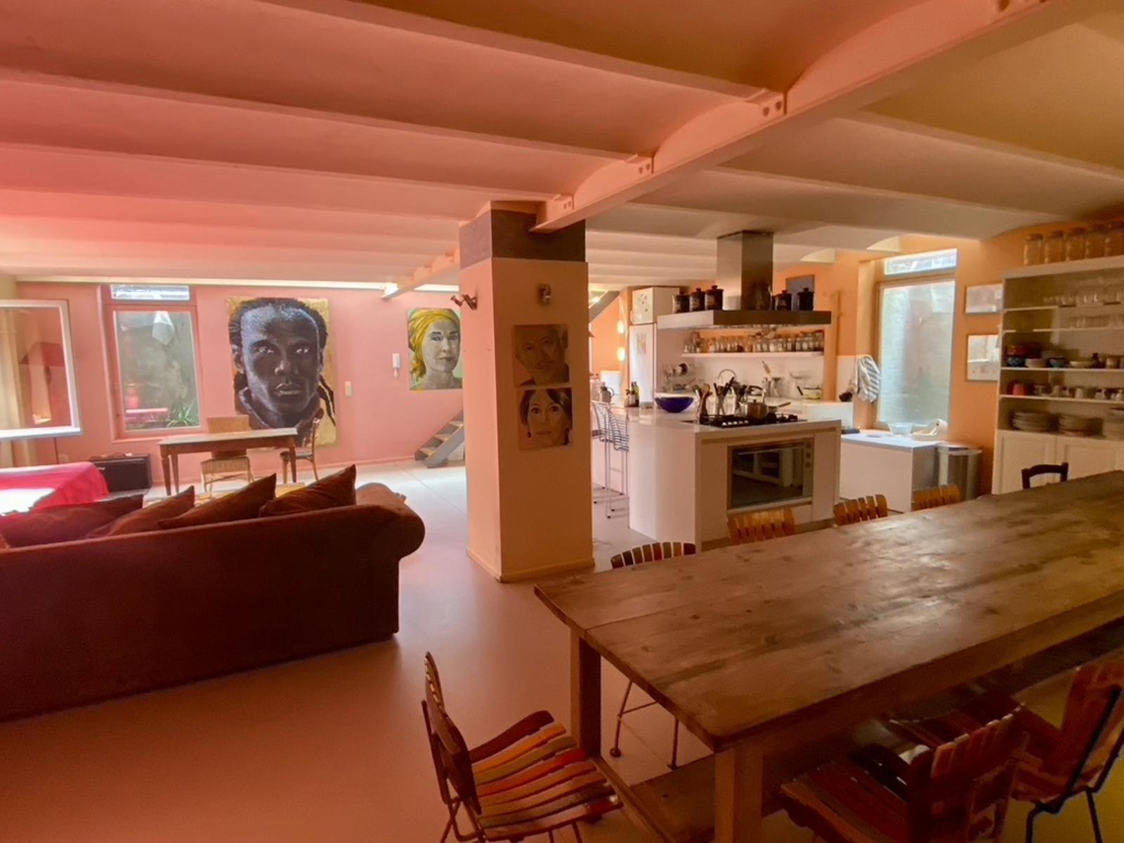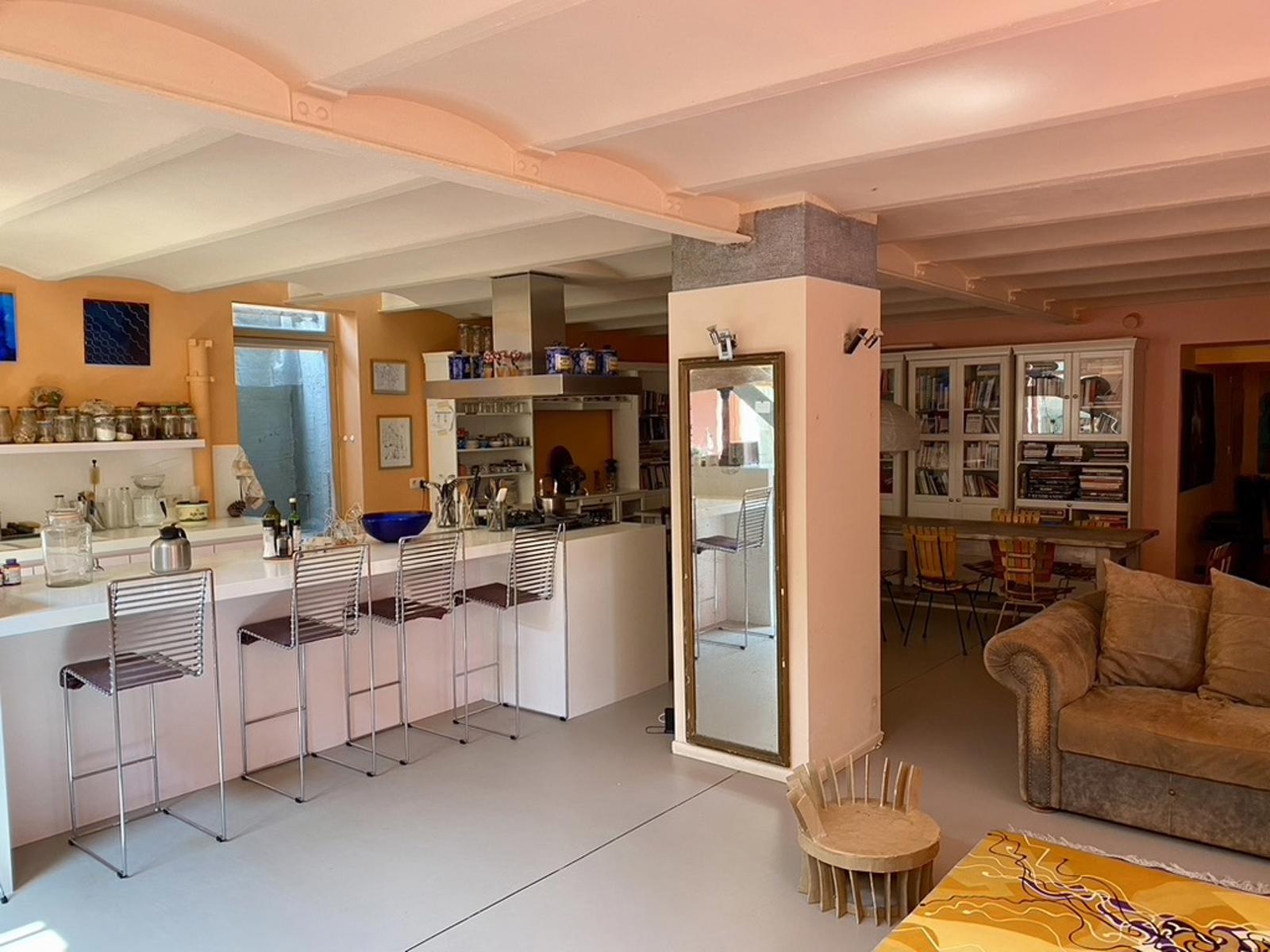On the ground floor, the main entrance with double doors opens onto a large hall comprising the cloakroom, the guest toilet and the staircase leading to the mezzanine. On the left, the first large bedroom (35 m2) and its bathroom (bath, double sink and toilet). On the right, a huge living room (84 m2) enjoying a beautiful light thanks to its 7 large windows. A double glazed door leads to a small garden of which the occupant of the loft has exclusive enjoyment.