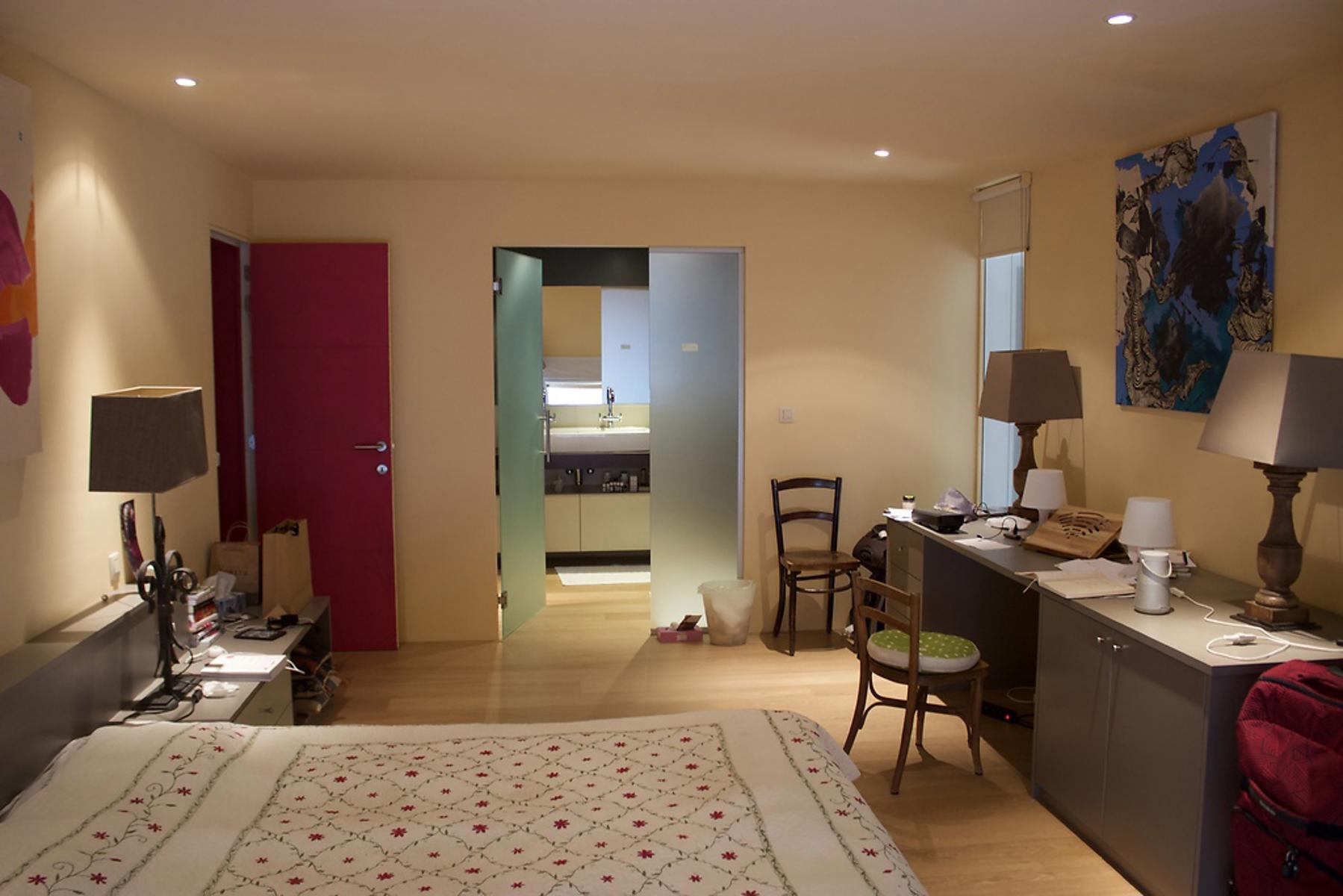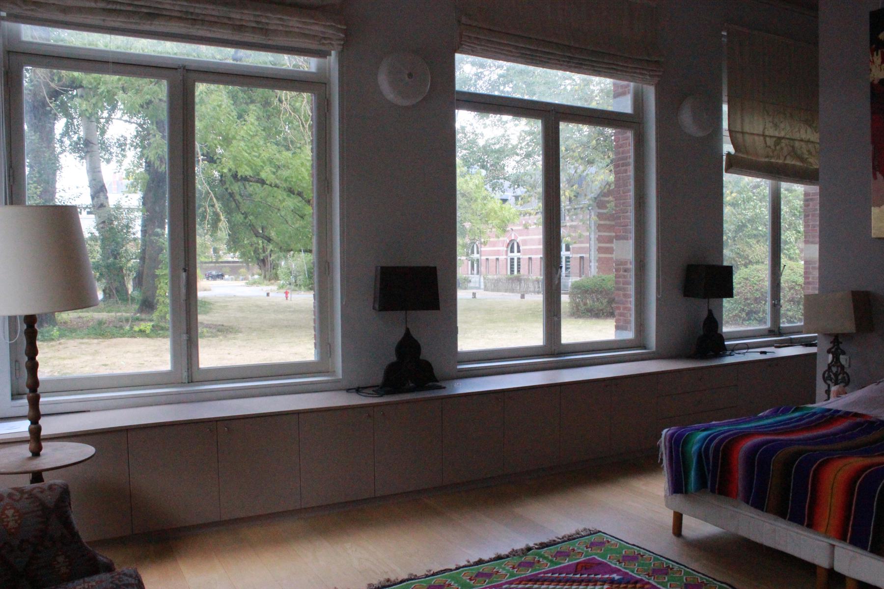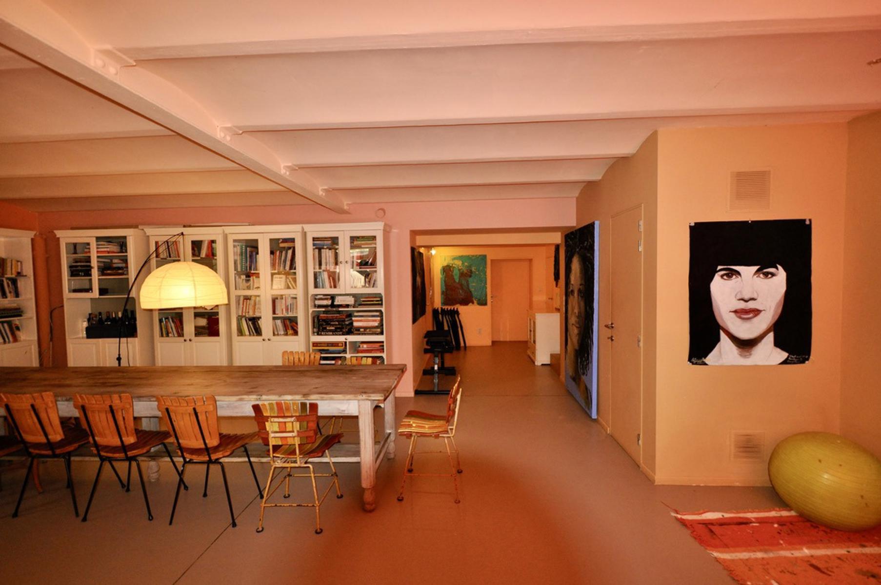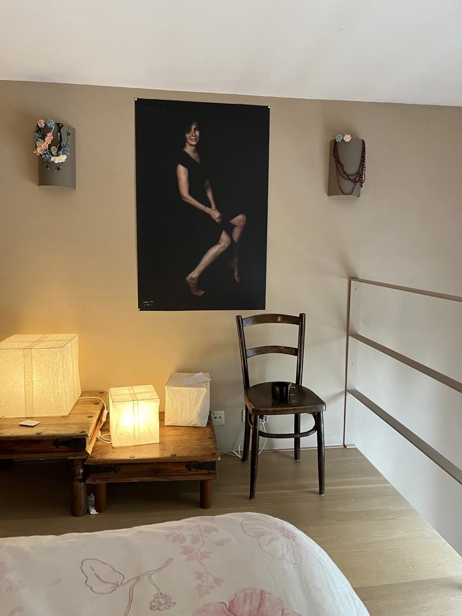 On the ground floor, the main entrance with double doors opens onto a large hall comprising the cloakroom, the guest toilet and the staircase leading to the mezzanine. On the left, the first large bedroom (35 m2) and its bathroom (bath, double sink and toilet). On the right, a huge living room (84 m2) enjoying a beautiful light thanks to its 7 large windows. A double glazed door leads to a small garden of which the occupant of the loft has exclusive enjoyment.